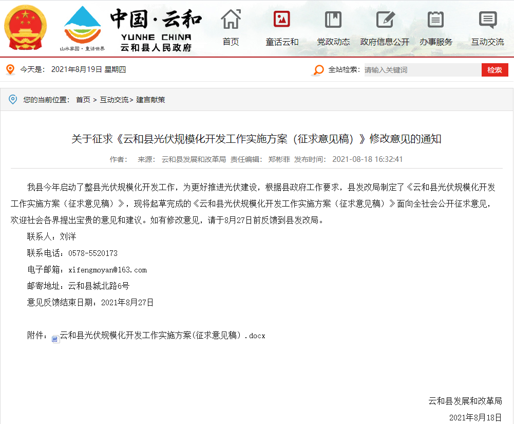 8月18日,云和縣發展和改革局發布關于征求《云和縣光伏規?;_發工作實施方案(征求意見稿)》修改意見的通知。